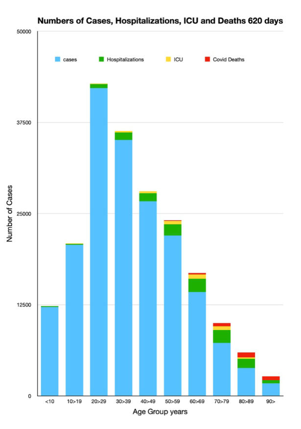 Although the size of the bars may seem alarming at first, note the scale on the left axis of the graph. The scale goes from 0 percent up to 1.0 percent. The graph has been expanded 100X. Over a period of 620 days, going on two miserable years, very few people have died under the age of 70. Even for those septuagenarians and octogenarians the deaths have been a fraction of one percent. The ninety year olds are taking the brunt of Covid with a 620 day mortality of slightly less than one percent of their population.