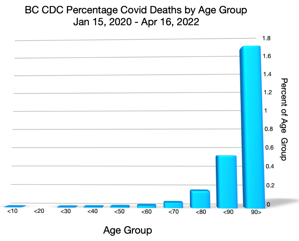 The above deaths occurred over a 27 month period between January 15, 2020 to April 16, 2022. There were a total of 3098 deaths or about 4 deaths per day in a population of 5.3 million. This represents about 6 deaths in every 10,000 British Columbians over this time. According to the BC CDC data there have been only 2 deaths in the under 10 age group, no deaths in the 10 to 20 age group, 6 deaths in the 20 to 30 age group and 34 deaths in the 30 to 40 age group.