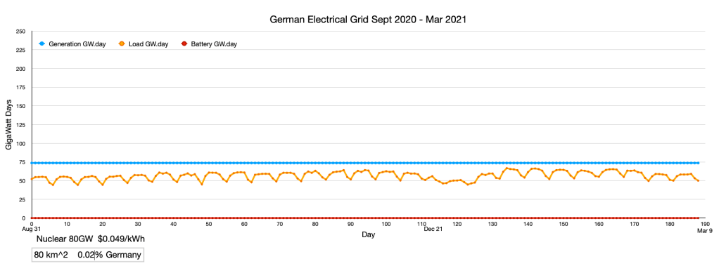An installation of 80 GW of nuclear power can produce enough power to constantly supply the current German grid. The installation would cost about $480 billion and with a 92% capacity factor for new nuclear would provide 73.6 GW of electricity at a wholesale cost of $0.038/kWh for each kWh produced. Over a lifespan of 40 years, with the recommended excess capacity of 15% for thermal electricity, the cost would be about $0.049/kWh. The excess electricity from nuclear is more reliable than wind and solar and could perhaps be sold to neighbouring grids at positive pricing.
