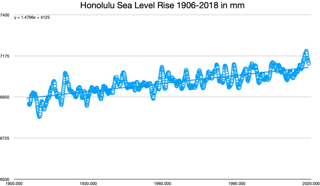 The yellow line through the data points is a line of best fit and it shows a change from 6948 mm in 1909 rising to 7025 mm in 2017, a total increase of 77 mm or a little over 3.0 inches over 109 years. That is 0.706 mm per year, the thickness of a dime.