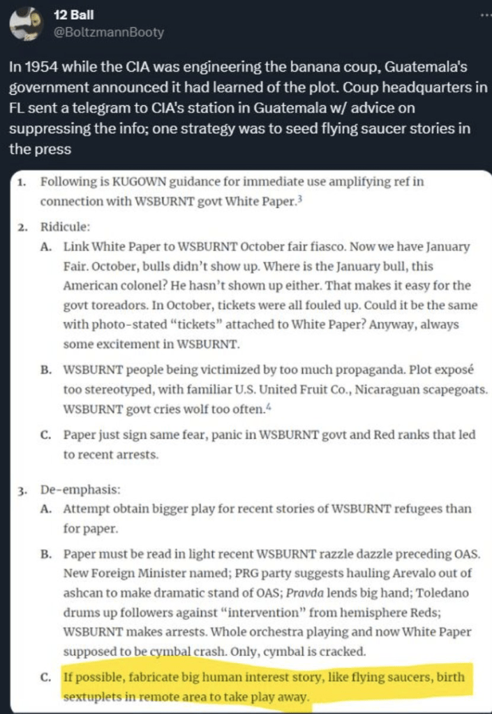 It turns out that the CIA likes to use “UFOs” to distract the public. According to Darren’s tweet, the CIA used this very tactic in Guatemala, of all places.