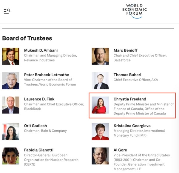 So who is our government working for? We taxpayers are footing the ever increasing bills but the government shills seem to be speaking for a globalist agenda while poor Canadians are getting poorer. In the above screen shot, taken today from the WEF website, there is Chrystia Freeland on the Board of Trustees hobnobbing it... Continue Reading →