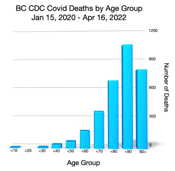 The above graph shows the deaths in British Columbia from/with Covid over the 27 months from Jan 2020 up to Apr 2022. The BC CDC gives this disclaimer: The word overestimate kinda jumps out. The recorded deaths include any death within 30 days of a positive Covid test. I presume from this that a heart... Continue Reading →